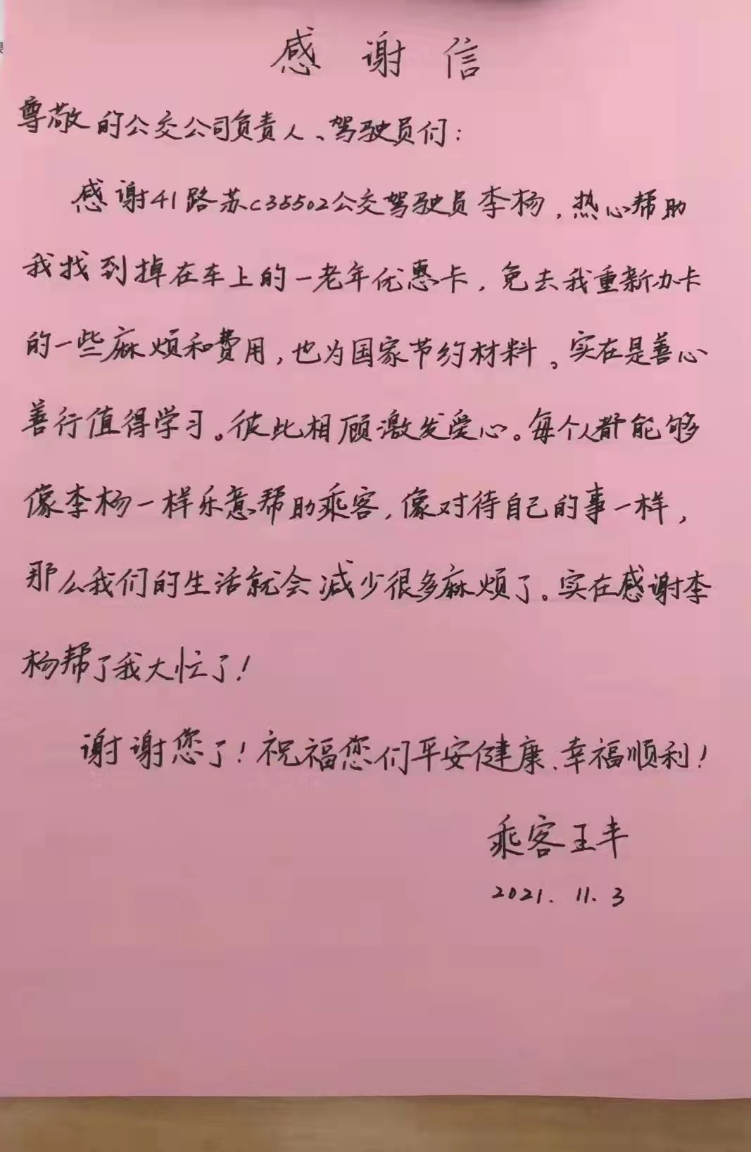 新區(qū)公司駕駛員李楊駕駛41路蘇C35502號車,行駛至銀湖小區(qū)站臺時,乘客王女士向其求助。王女士告訴駕駛員,早晨10點20分左右,她乘坐41路公交車時,不慎將老年優(yōu)惠卡丟在了車上,希望李楊幫她尋找一下。李楊留下了王女士的電話,待車輛到達建筑學院后,李楊立即去調(diào)度室尋找,根據(jù)王女士提供的乘車時間很快鎖定了車輛,經(jīng)詢問,王女士的老年優(yōu)惠卡已被駕駛員交到了調(diào)度室妥善保管。11月3日下午,王女士取回了失而復得的老年優(yōu)惠卡,并送來感謝信。