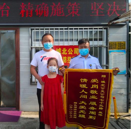 7月24日上午,市民張先生一家人專程來(lái)到楊山路調(diào)度室,將一面寫(xiě)有“愛(ài)崗敬業(yè)、服務(wù)周到、情暖人間、大愛(ài)無(wú)疆”字樣的錦旗送到73路駕駛員鹿偉的手中,感謝他幫助迷路的孩子找到家人。