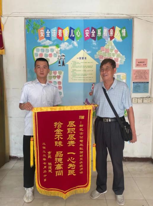 2022年7月25日上午,市民陳老先生拿著一面印有“盡職盡責(zé)一心為民,拾金不昧品質(zhì)高尚”的錦旗,來(lái)到徐州公交新巴士公司湖濱調(diào)度室,表?yè)P(yáng)和感謝18路公交駕駛員張猛。