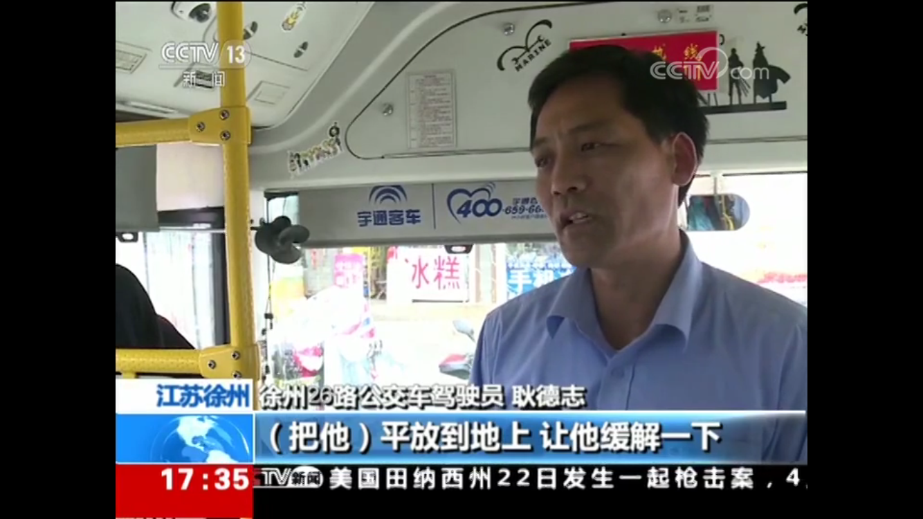 4月20日下午4點58分,26路自編號5025車從徐州開往賈汪途中,一名坐在車中間座位上的男乘客突然倒在了旁邊乘客身上,口吐白沫,渾身抽搐打著哆嗦,情況十分危急。乘務(wù)員昝昱安和周圍乘客立即上前查看,駕駛員耿德志也急忙停下車趕來。