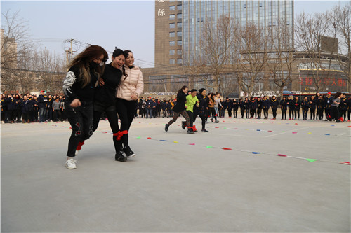 “參賽隊員各就各位!裁判員準(zhǔn)備計時!”運動會主持人一聲令下,首先開始比拼的項目是需要隊員齊心協(xié)力,發(fā)揚合作精神的“三人四足接力賽”,三人一組紅繩綁腿齊步走,每隊12名參賽隊員,比的是速度,更是勁兒往一處使的同心合力?!凹佑?!加油??!”“一二!一二!”比賽場上運動員的號子聲和場外女工們的加油聲、歡笑聲交織一起,此起彼伏。