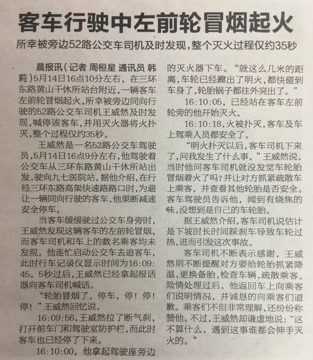5月14日16點10分左右,在三環(huán)東路黃山干休所站臺附近,一輛客車左前輪冒煙起火,所幸被旁邊同向行駛的52路公交車司機(jī)王威然及時發(fā)現(xiàn),喊停該客車,并用滅火器將火撲滅,整個過程僅約35秒。
