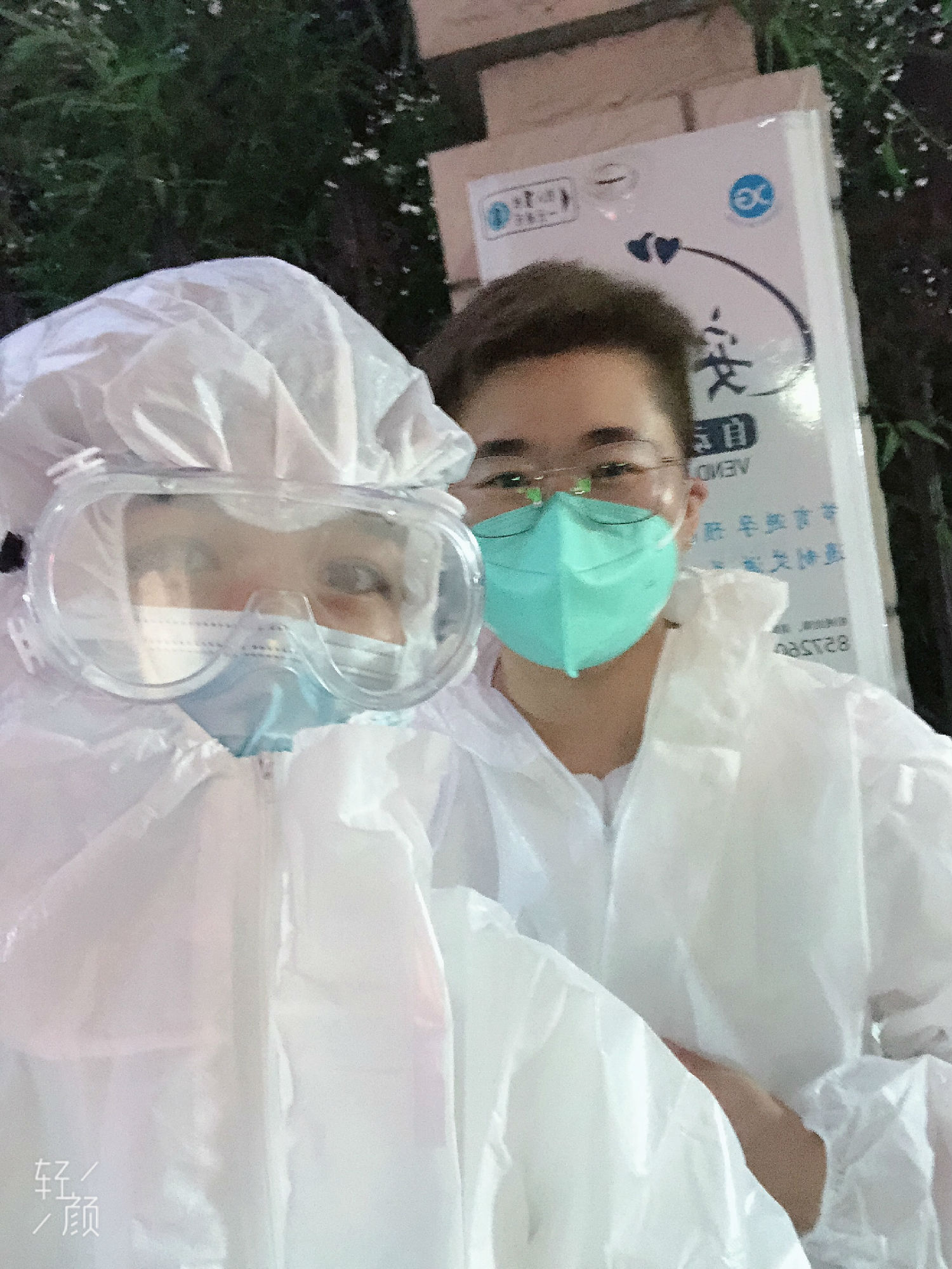 “請大家不要著急,排好隊(duì)、戴好口罩,保持一米距離。”身穿防護(hù)服的她們高聲引導(dǎo)。短短兩天時間她們親身體驗(yàn)到了醫(yī)護(hù)人員的辛苦。“這是我們倆第一次穿上防護(hù)服,和之前電視里看到一樣,脫下防護(hù)服后皮膚上有深深的勒痕,但是穿上的那一刻就感到責(zé)任重大!”兩個年輕人“苦中作樂”用照片記錄下自己這段特殊的經(jīng)歷。