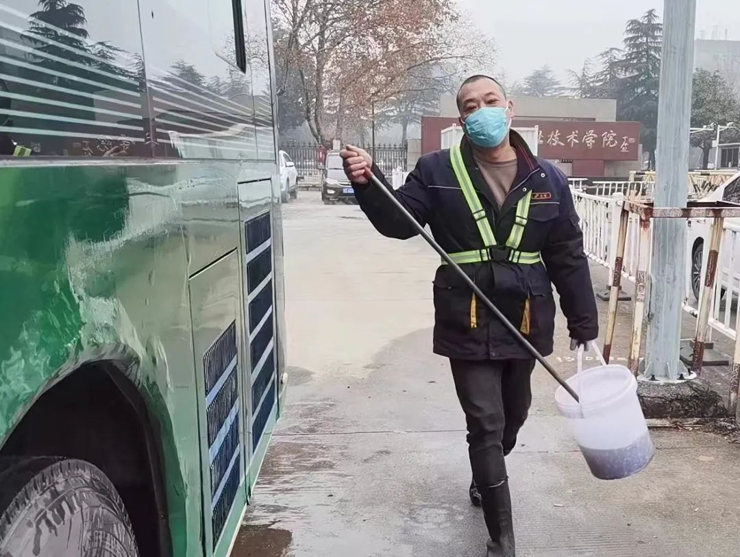 春運期間,為保障廣大市民乘客出行需求,部分公交線路縮短了發(fā)車時間,增加了運營車輛,再加上客流增多,路面擁堵等情況,公交車回到終點站停放的時間很短,又要投入到下一趟的運營當中,這無疑給車輛保潔工作帶來了一定的困難。因此,為確保出場車輛干凈整潔,每天天沒亮,張璞已經(jīng)在建筑學(xué)院停車場里忙起來了。只見他一手拿毛刷,一手拎水桶,開始清潔車廂外部,張璞動作嫻熟地擦拭前擋風(fēng)玻璃、車廂外部兩側(cè),不一會,他的臉上就已掛滿了汗珠,平均一輛車10分鐘的清潔時間,是他十多年工作鍛煉出來的速度。近日氣溫驟降,持續(xù)有冰凍天氣,如果抹布太濕,早晨擦座椅時會粘在上面,為此張璞都會提前準備好潮濕的抹布,既能擦掉扶手、座椅、靠背上的浮塵,還不會留下水漬。像這樣日復(fù)一日的簡單工作,張璞堅持了十多年,他平均每天要打掃23臺車,平均一輛車10分鐘的清潔時間,張璞用自己的勞動,換來了車輛的干凈整潔。