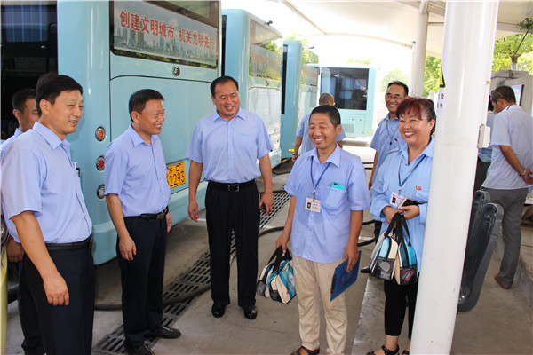 炎炎烈日下,空調(diào)公交車成為市民出行首選。為給市民營(yíng)造舒適、涼爽的乘車環(huán)境,各運(yùn)營(yíng)公司應(yīng)用公交GPS智能調(diào)度系統(tǒng),科學(xué)調(diào)度、靈活排班、保證運(yùn)力充足。同時(shí),結(jié)合創(chuàng)建工作,提高服務(wù)質(zhì)量,全市2100多輛空調(diào)車全部開(kāi)足冷氣;駕乘人員揮汗如雨堅(jiān)持“一趟一清掃”,認(rèn)真做好車輛清潔工作;督導(dǎo)隊(duì)員冒著高溫在各大站臺(tái)維持秩序、扶老攜幼、做好導(dǎo)乘服務(wù)、嚴(yán)查易燃易爆及危險(xiǎn)品。由于各項(xiàng)舉措落實(shí)到位,確保了高溫期間全市161條公交線路運(yùn)營(yíng)順暢,乘客走好走了。(圖為董事長(zhǎng)、總經(jīng)理杜紅軍,總經(jīng)理助理李修超一行在食品城充電站慰問(wèn)堅(jiān)守崗位的充電員工。)