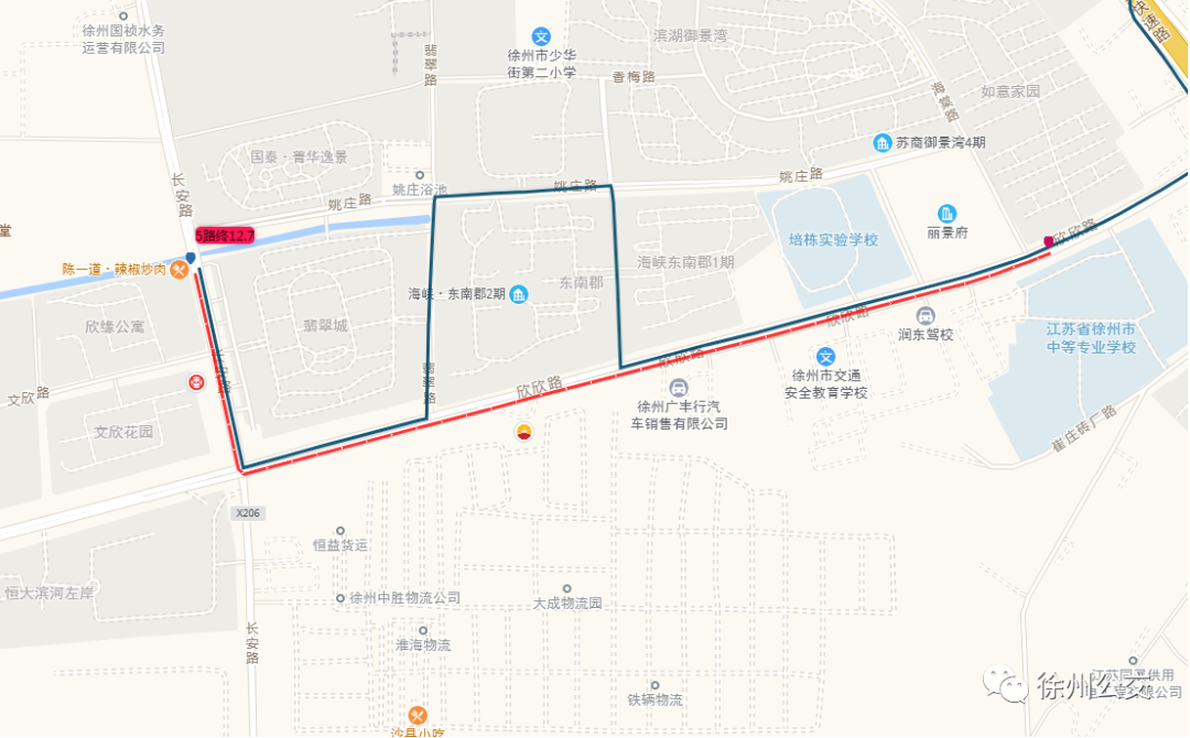 5路開往萬虹橋電子市場方向,由翡翠城發(fā)車后,經長安路左轉進入欣欣路。